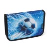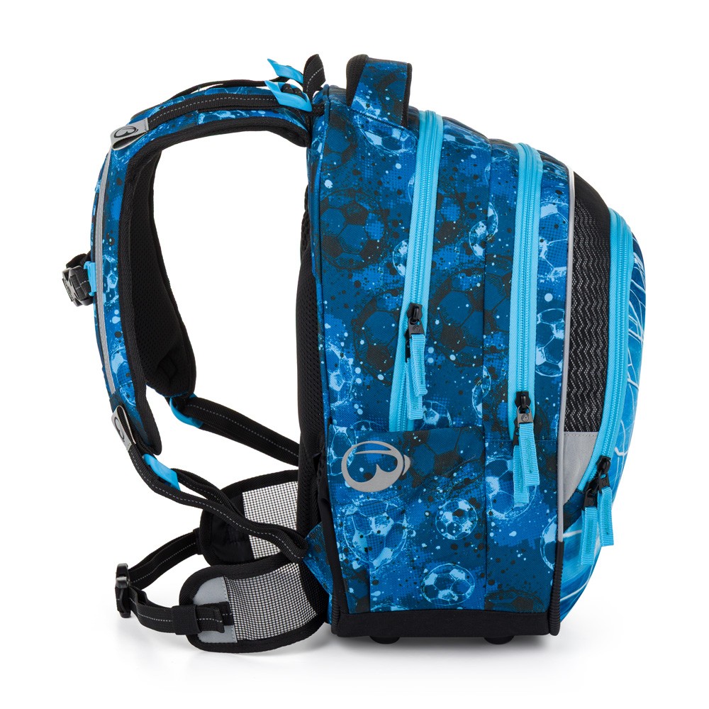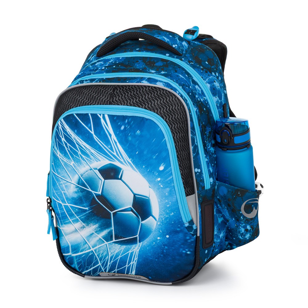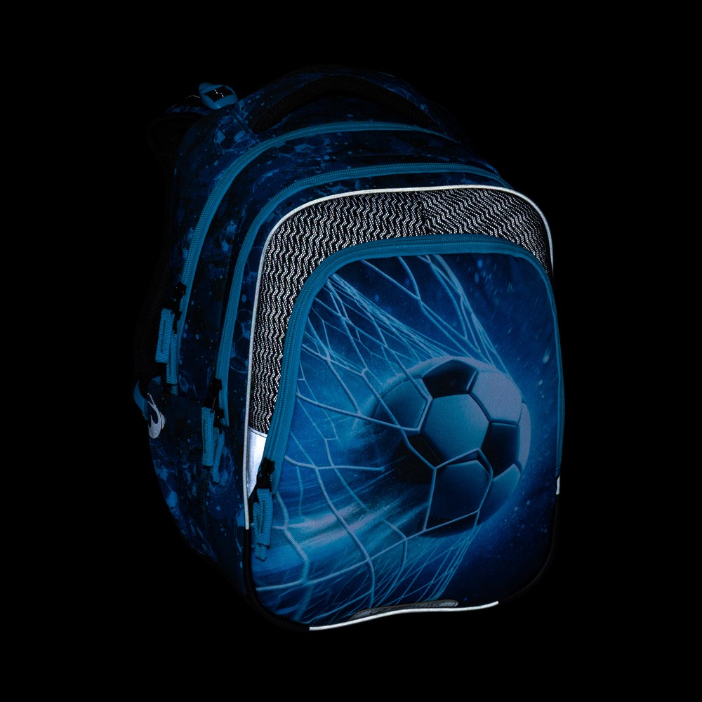 Háromrekeszes iskolai szuperhátizsák elsősöknek, akik szeretik a focit és a kék színt. Súlya kevesebb mint egy kilogramm, új, biztonságos hátkialakítással és derékpánttal, fényvisszaverő elemekkel, praktikus rendszerezővel és oldalsó italtartó zsebbel rendelkezik. Az anatómiailag formázott vállpántokon és a hátrészen található hálós anyag puha, nem dörzsöl és nem irritálja a bőrt. A szett teljes felszerelést tartalmaz: színben összehangolt tolltartót, tornazsákot, uzsonnás dobozt és kulacsot.