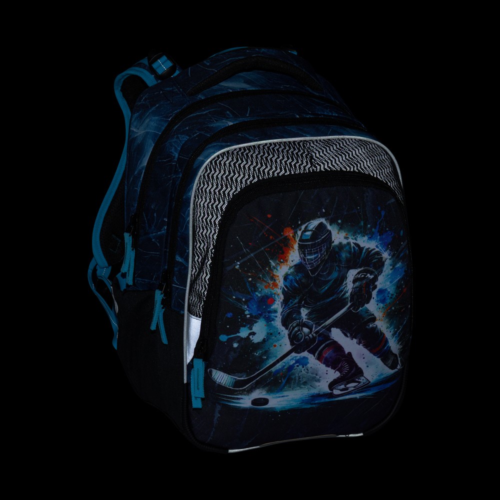 Háromrekeszes szuper iskolatáska elsősöknek, akik szeretik a jégkorongot. Kevesebb mint egy kilogrammot nyom, új, biztonságos hátkialakítással és derékpánttal rendelkezik, fényvisszaverő elemekkel, praktikus szervezővel és oldalsó palacktartó zsebbel. Az anatómiailag formázott vállpántokon és a hátrészen található hálós anyag puha és nem dörzsöl. A szett teljes felszerelést tartalmaz: összeillő tolltartót, tornazsákot, uzsonnás dobozt és kulacsot.
