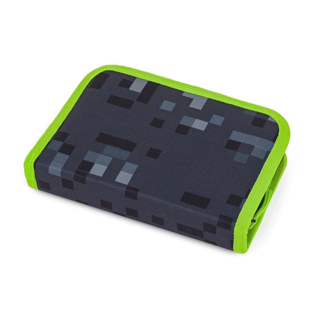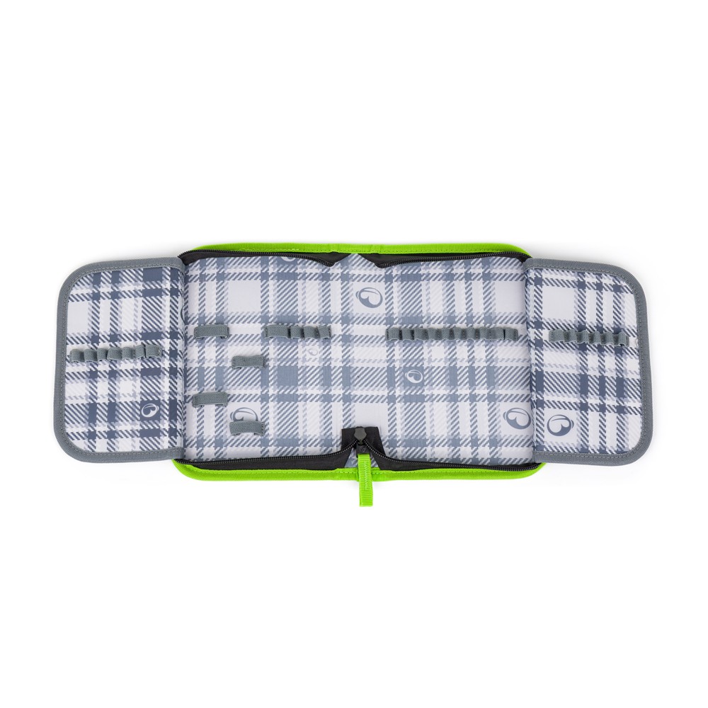 A két nyitható szárnyon 35 rugalmas gumibetét található zsírkréták, tollak, filctollak, radírok, iránytűk és egyebek számára.