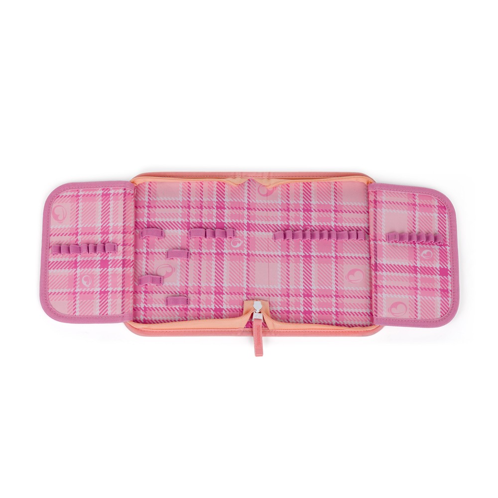 A két nyitható szárnyon 35 rugalmas gumibetét található zsírkréták, tollak, filctollak, radírok, iránytűk és egyebek számára.