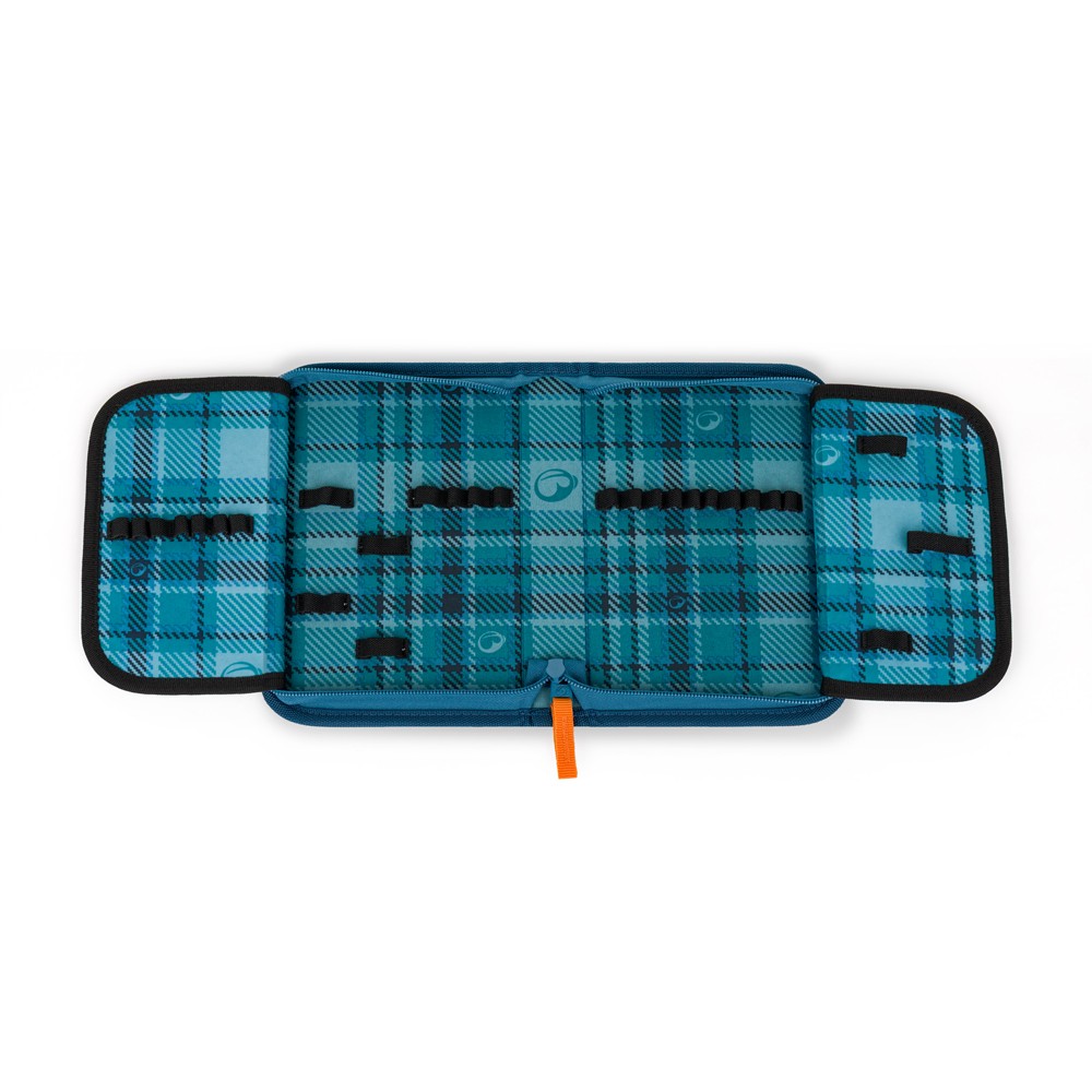 A két nyitható szárnyon 32 rugalmas gumibetét található zsírkréták, tollak, filctollak, radírok, iránytűk és egyebek számára.